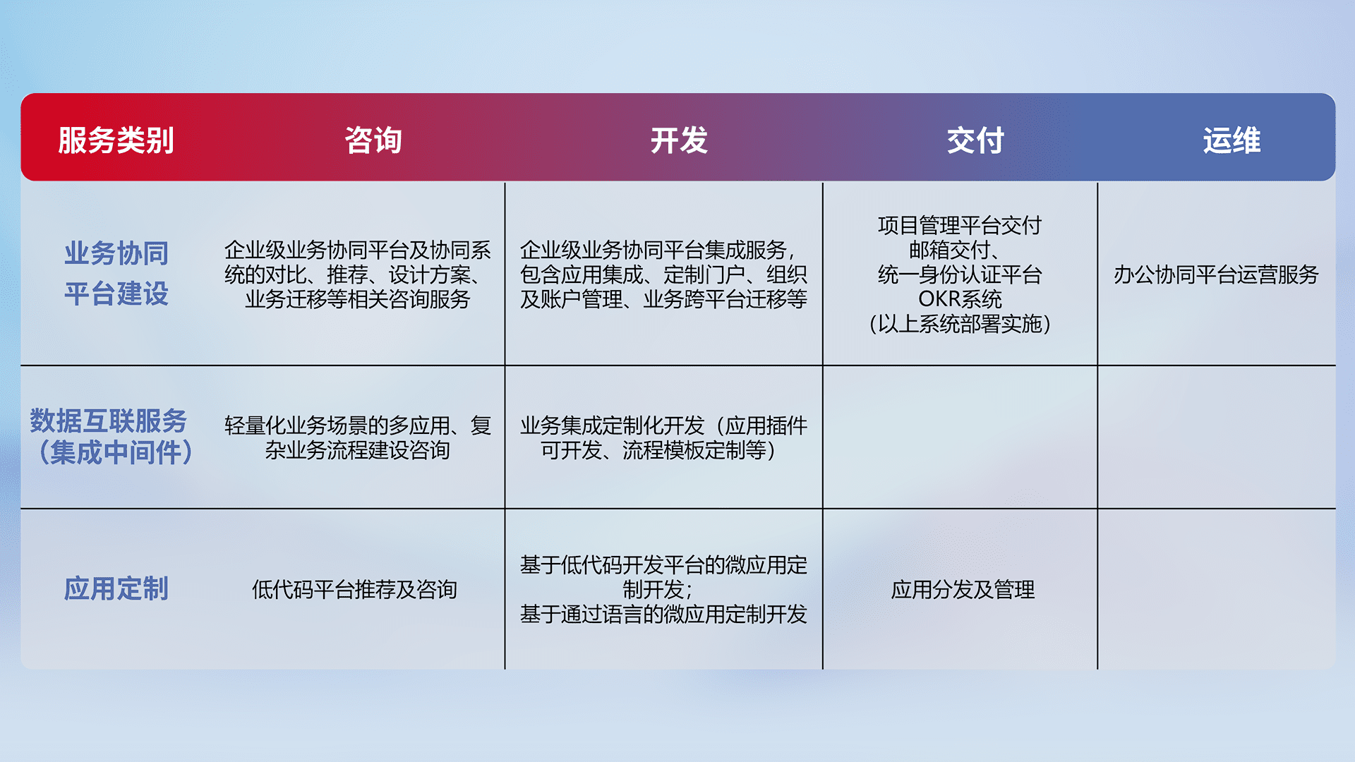 针对钉钉、、、、企微、、、IDaas等平台级产品提供产品的规划、、方案、、、、交付、、、定制化开发等服务,,,实现如统一协同办公、、智能客户服务、、、、混合会议管理、、、、智能数据查询、、、等业务场景,,实现数字化转型。。。